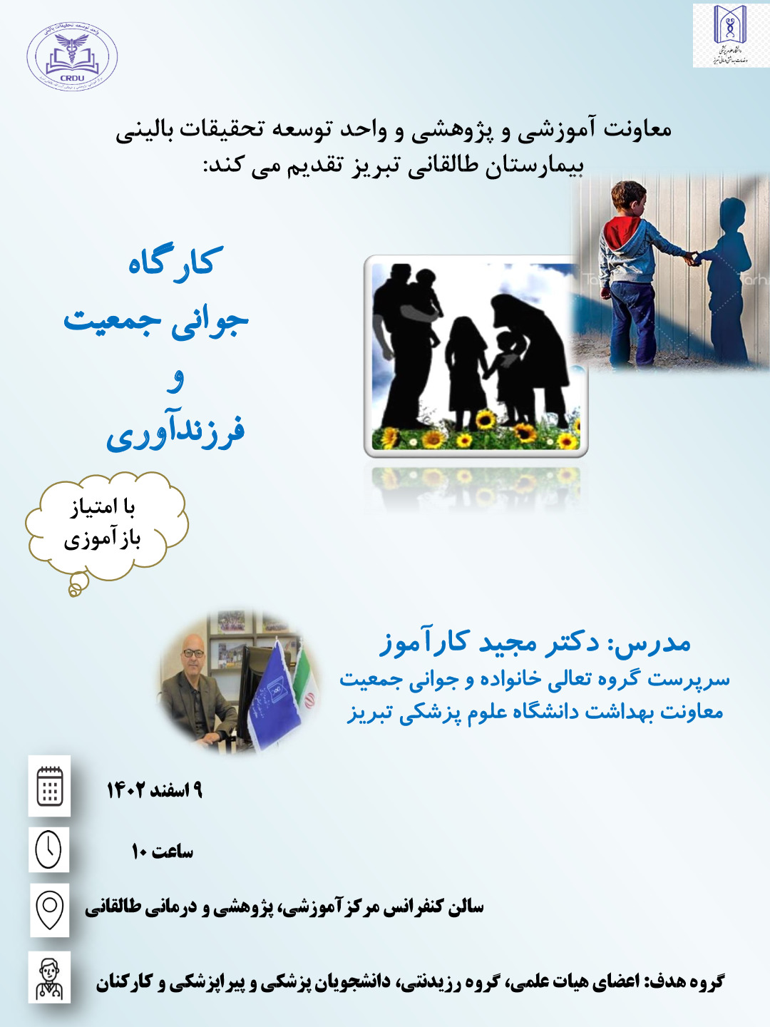 واحد توسعه تحقیقات بالینی مرکز آموزشی و پژوهشی بیمارستان طالقانی،کارگاه علمی تحت عنوان " جوانی جمعیت و فرزند آوری " را روز چهارشنبه 9 اسفندماه 1402 در سالن کنفرانس مرکز برگزار می کند