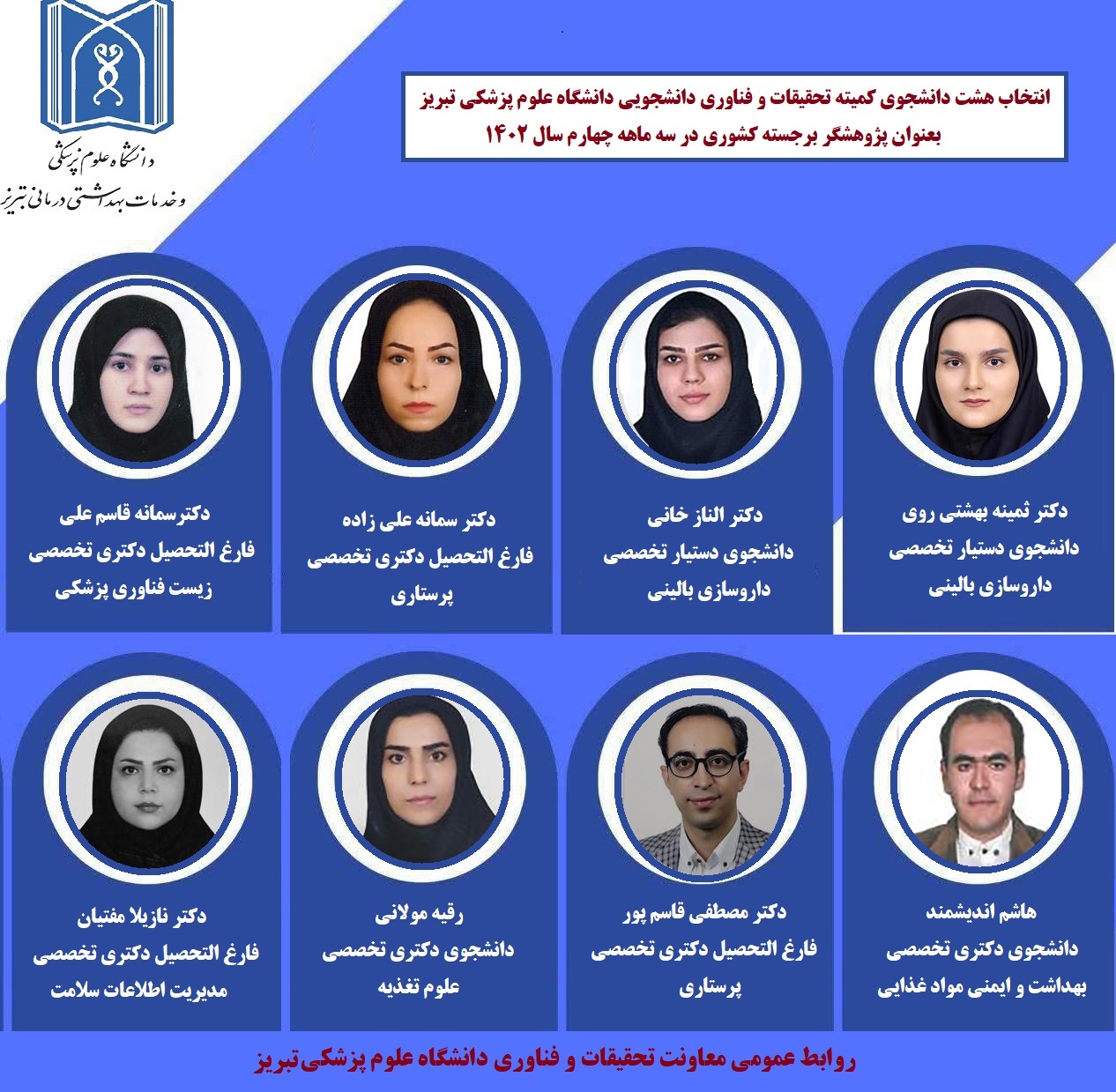 کمیته تحقیقات و فناوری دانشجویی از انتخاب هشت دانشجوی دانشگاه علوم پزشکی تبریز بعنوان پژوهشگر برجسته کشوری مطابق بند " ک " در سه ماهه چهارم سال 1402 خبر داد