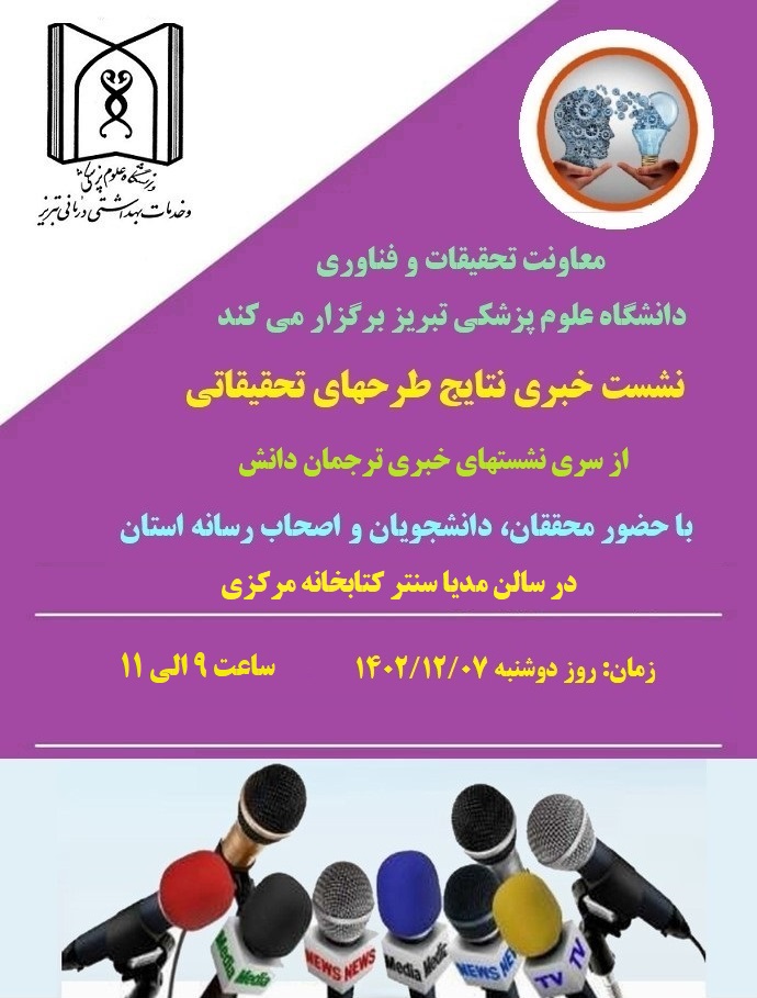 در راستای کاربردی کردن نتایج پژوهشهای سلامت، معاونت تحقیقات و فناوری دانشگاه علوم پزشکی تبریز، روز دوشنبه 7 اسفندماه 1402، نشست خبری نتایج طرحهای تحقیقاتی را با حضور محققان، دانشجویان و اصحاب رسانه در سالن مدیا سنتر کتابخانه مرکزی برگزار می کند
