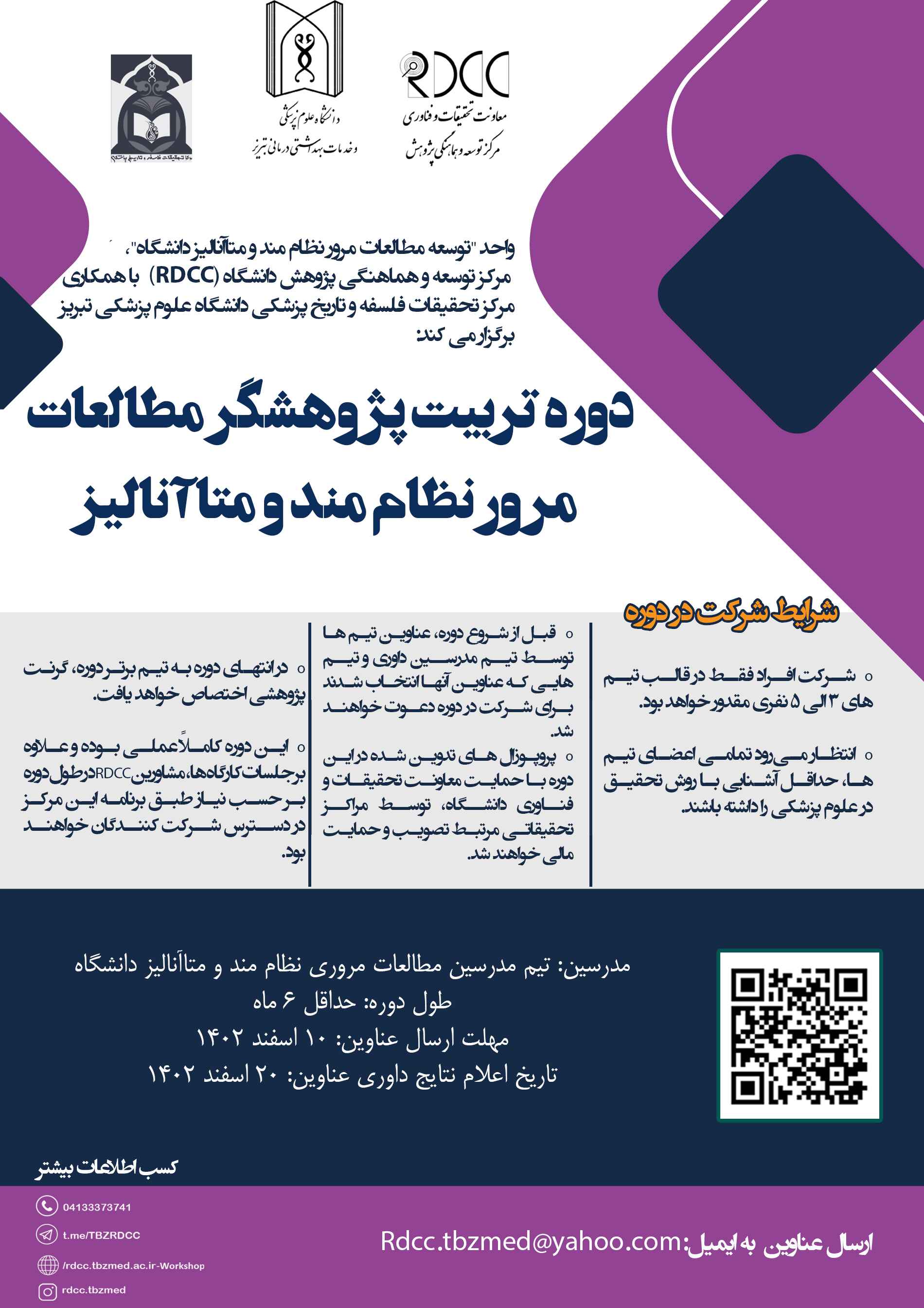 واحد توسعه مطالعات مرور نظام مند و متاآنالیز، مرکز توسعه و هماهنگی پژوهش(RDCC) و مرکز تحقیقات فلسفه و تاریخ پزشکی دانشگاه،دوره تربیت پژوهشگر مطالعات مرور نظام مند و متاآنالیز را به مدت حداقل شش ماه برگزار می کند