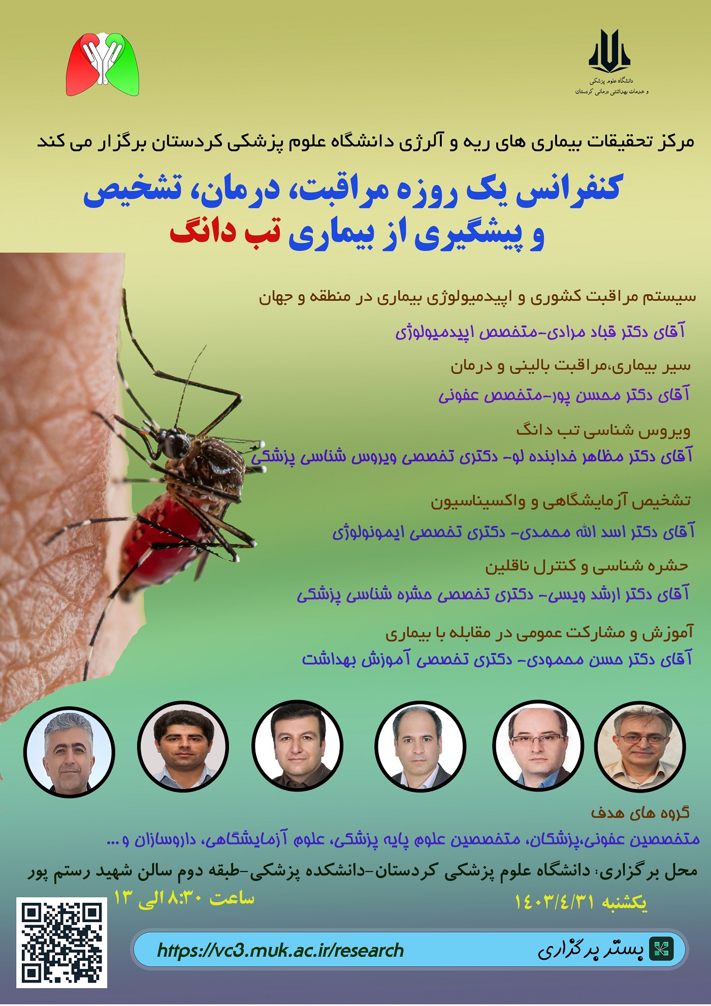 کنفرانس یک روزه مراقبت درمان تشخیص و پیشگیری از بیماری تب دانگ به صورت حضوری و مجازی 31 تیرماه 1403 در دانشگاه علوم پزشکی کردستان برگزار می شود