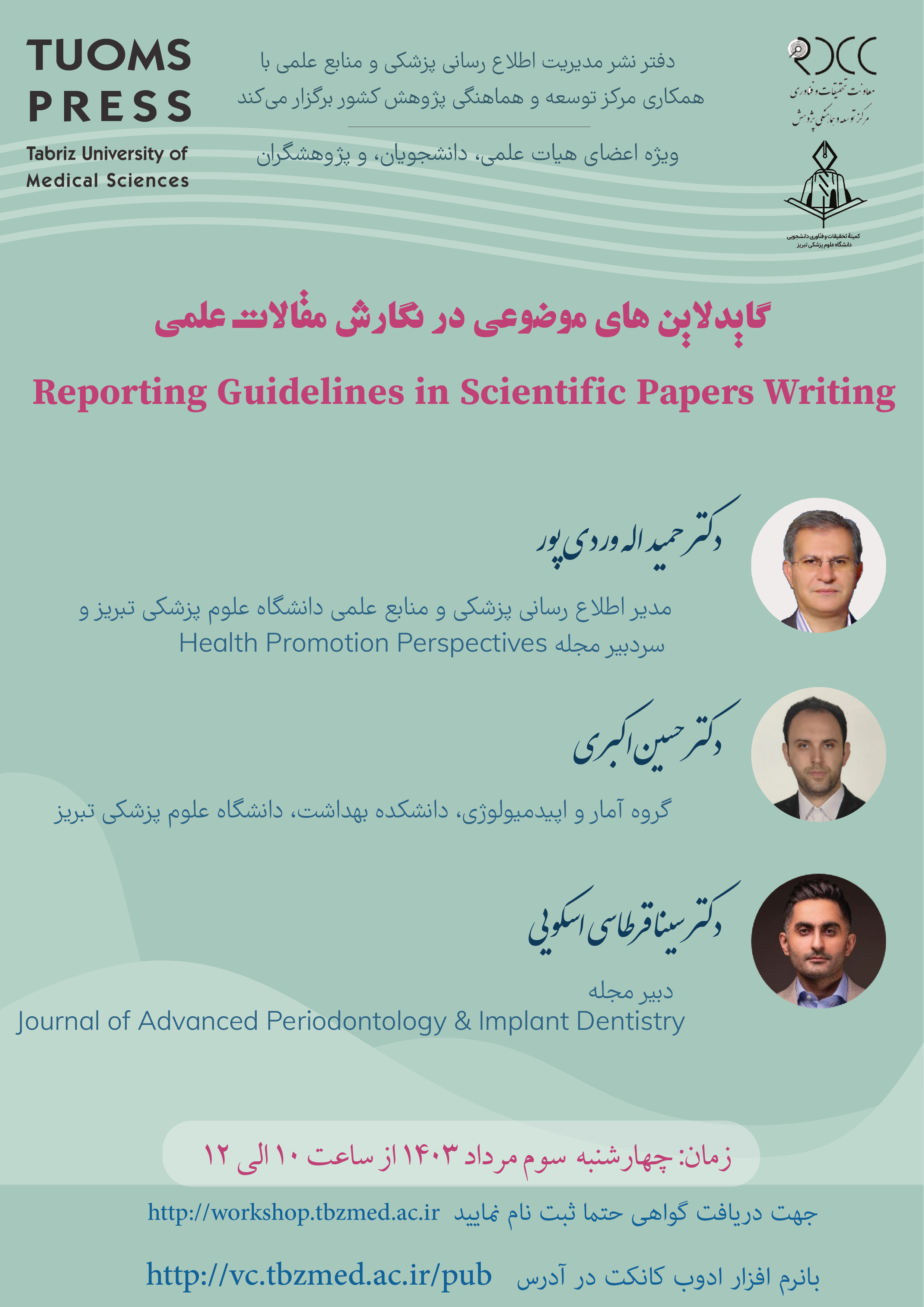 علاقه مندان عزیز میتوانند در این کارگاه بصورت مجازی با نرم افزار ادوب کانکت در آدرس «http://vc.tbzmed.ac.ir/pub» شرکت کنند.