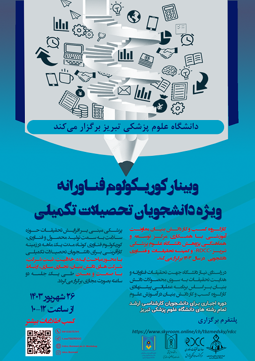 به گزارش روابط عمومی معاونت تحقیقات و فناوری، مرکز توسعه و هماهنگی پژوهش دانشگاه علوم پزشکی تبریز (RDCC) با همکاری کارگروه کسب و کار دانش بنیان معاونت آموزشی و کمیته تحقیقات و فناوری دانشجویی، وبینار مجازی "کوریکولوم فناورانه ویژه دانشجویان تحصیلات تکمیلی" را روز دوشنبه 26 شهریورماه 1403 ساعت 10 الی 12در بستر اسکای روم برگزار می کند.