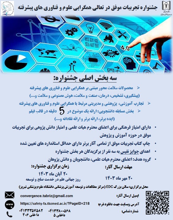 دانشگاه علوم پزشکی تبریز در راستای اجرای برنامه جامع عدالت، تعالی و بهره وری در آموزش علوم پزشکی جشنواره تجربیات موفق در تعالی همگرایی علوم و فناوری های پیشرفته را برگزار میکند.