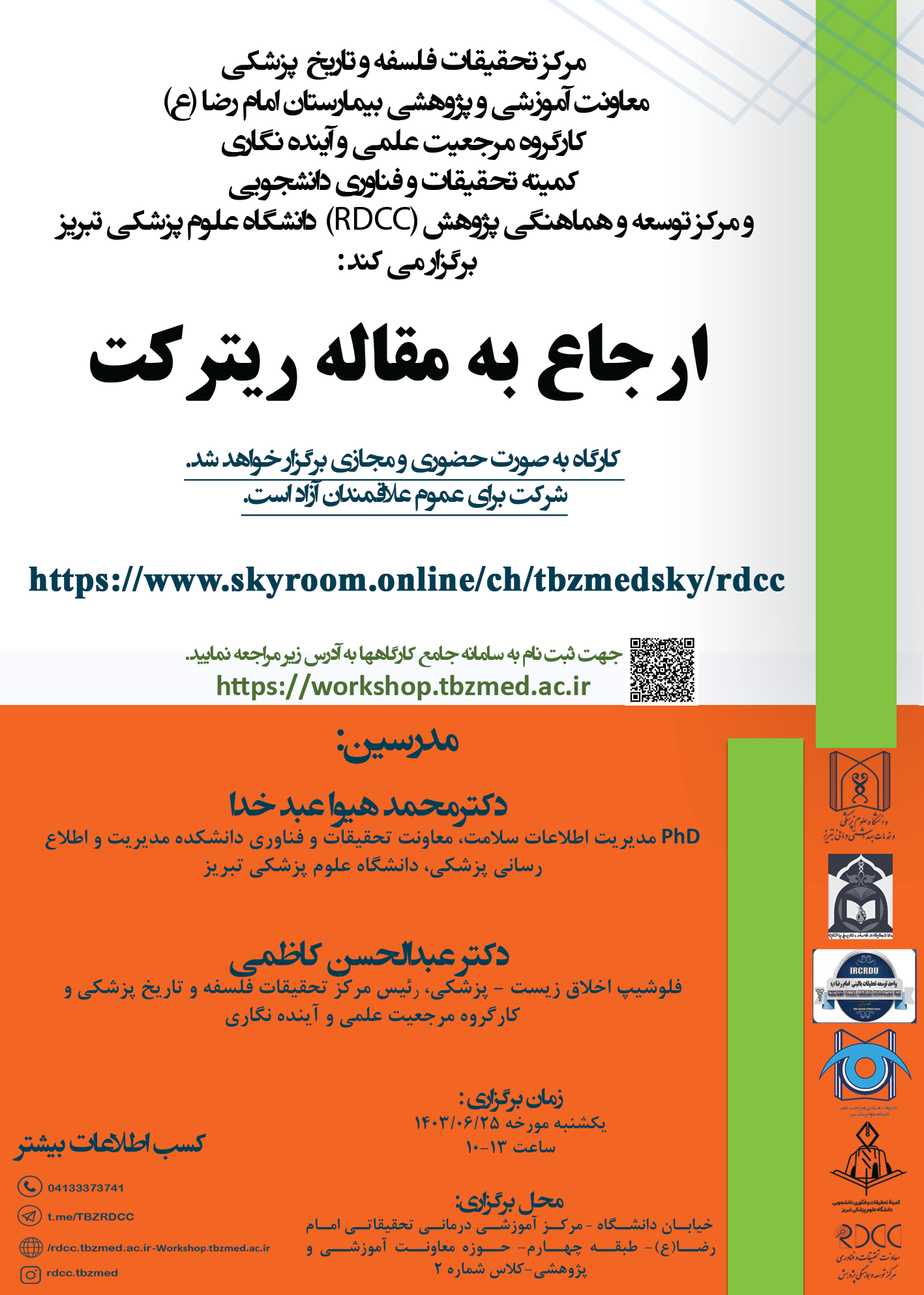 مرکز تحقیقات فلسفه و تاریخ پزشکی دانشگاه علوم پزشکی تبریز، معاونت آموزشی و پژوهشی بیمارستان امام رضا(ع) ، کارگروه مرجعیت علمی و آینده نگاری و کمیته تحقیقات و فناوری دانشجویی با همکاری مرکز توسعه و هماهنگی پژوهش (RDCC) کارگاه " ارجاع به مقاله ریترکت " را روز یکشنبه 25 شهریورماه برگزار می کند