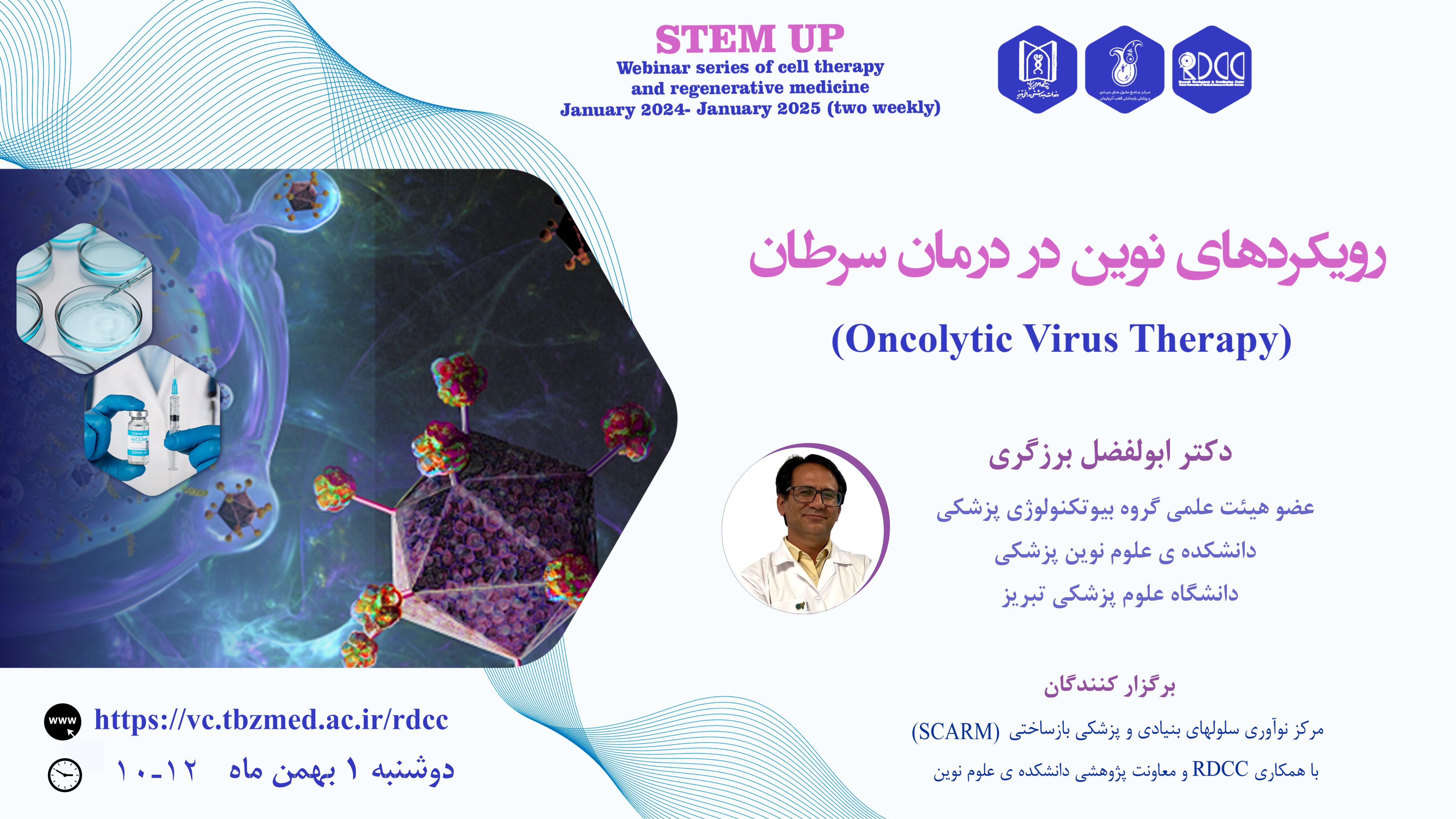 کارگاه آموزشی با عنوان " رویکردهای نوین در درمان سرطان " از سلسله وبینارهای سلول درمانی Stem up روز دوشنبه یکم بهمن ماه 1403 برگزار می شود