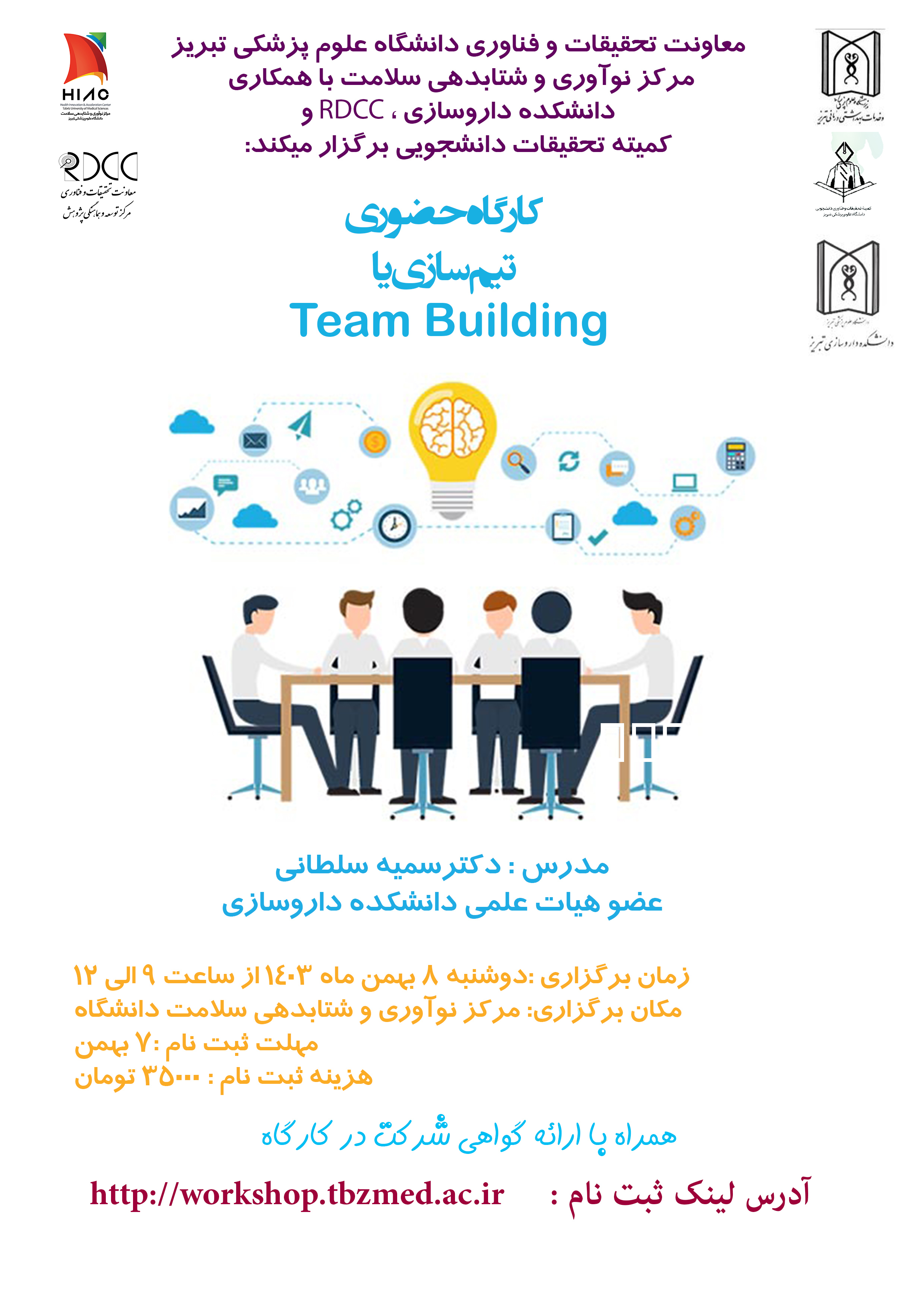 مرکز نوآوری و شتابدهی سلامت دانشگاه کارگاه حضوری " تیم سازی یا Team Building" را روز دوشنبه 8 بهمن ماه 1403 برگزار می کند