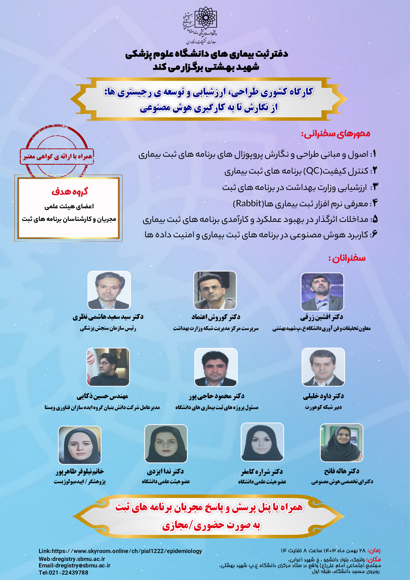 دفتر ثبت بیماری های دانشگاه علوم پزشکی شهید بهشتی کارگاه کشوری طراحی، ارزشیابی و توسعه ی رجیستری ها: از نگارش تا به کارگیری هوش مصنوعی همراه با پنل پرسش و پاسخ مجریان برنامه های ثبت به صورت حضوری و مجازی برگزار می کند
