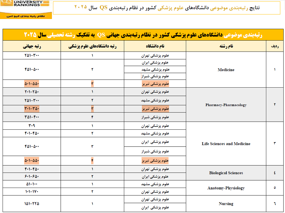 دانشگاه های علوم پزشکی تهران، ایران، مشهد ، شیراز و تبریز موفق به دریافت رتبه در نظام رتبه بندی موضوعی QS شدند .