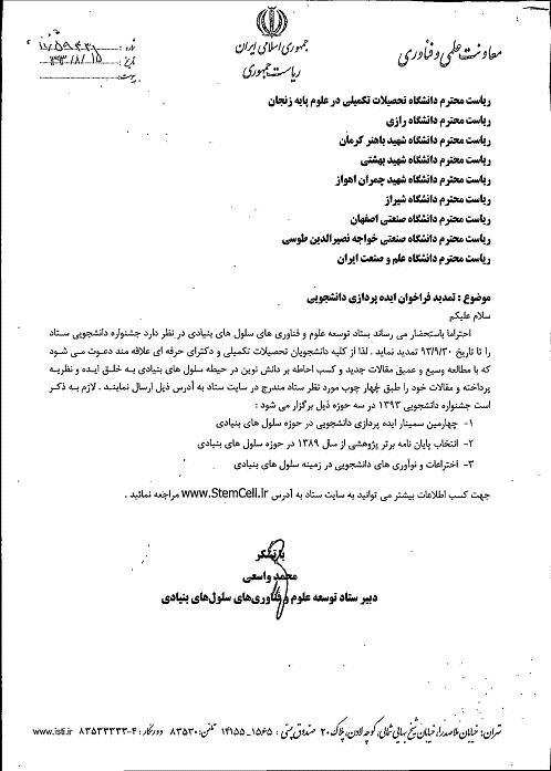 ستاد توسعه علوم و فناوري هاي سلول هاي بنيادي در نظر دارد جشنواره دانشجویی خود را تا تاريخ 30/9/93 تمديد نمايد
