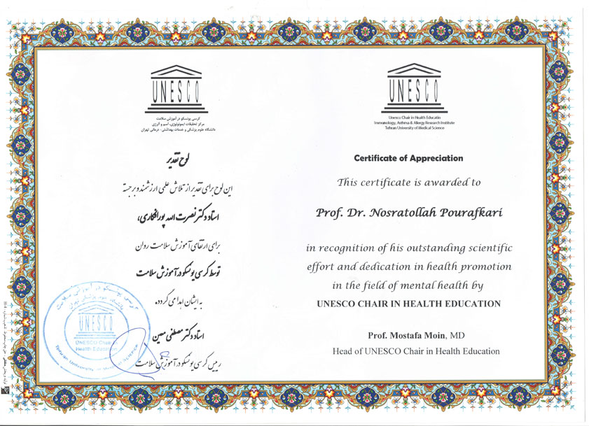 دریافت لوح تقدیر از کرسی یونسکو در آموزش سلامت حضور استاد فرزانه جناب آقای دکتر نصرت اله پورافکاری، استاد مشاور ریاست محترم دانشگاه علوم پزشکی تبریز در گروه روانپزشکی را تبریک عرض می نماییم.