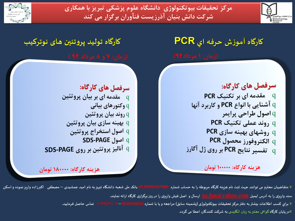 زمان : کارگاه PCR ( پنج شنبه 1 مرداد ماه) / کارگاه تولید پروتئین های نوترکیب ( چهارشنبه و پنج شنبه 8-7 مرداد ماه)