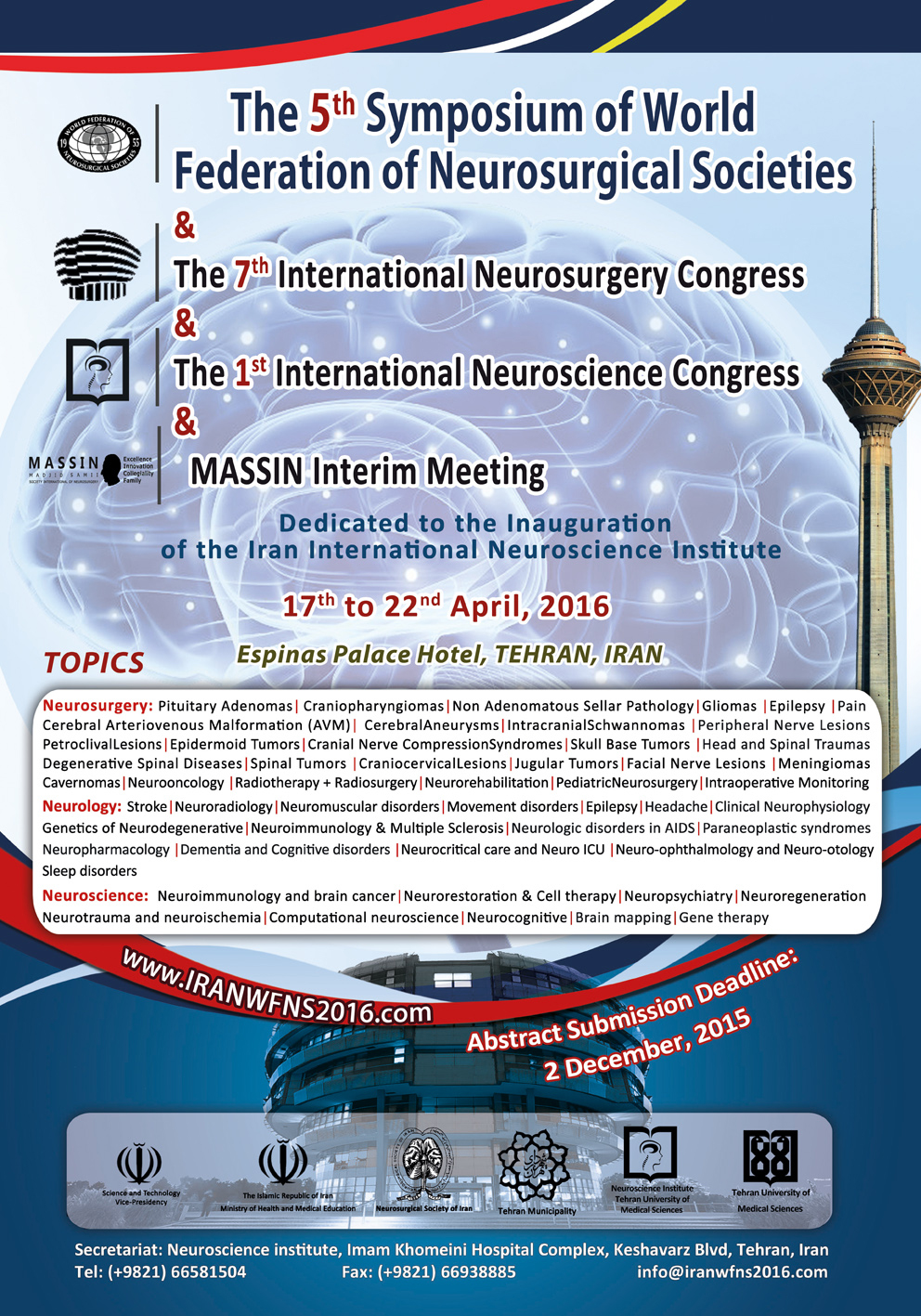 پنجمین سمپوزیوم فدراسیون جهانی و هفتمین کنگره بین المللی جراحان مغز و اعصاب و اولین کنگره بین المللی نوروساینس به میزبانی جمهوری اسلامی ایران توسط پژوهشکده علوم اعصاب دانشگاه علوم پزشکی تهران، پژوهشکده بین المللی مغز و اعصاب هانوفر و معاونت علمی و فناوری ریاست جمهوری و به ریاست پرفسور مجید سمیعی با همکاری کلیه دانشگاه ها و مراکز علمی کشور از 29 فروردین لغایت 3 اردیبهشت 1395 در تهران هتل اسپیناس پالاس برگزار می شود.