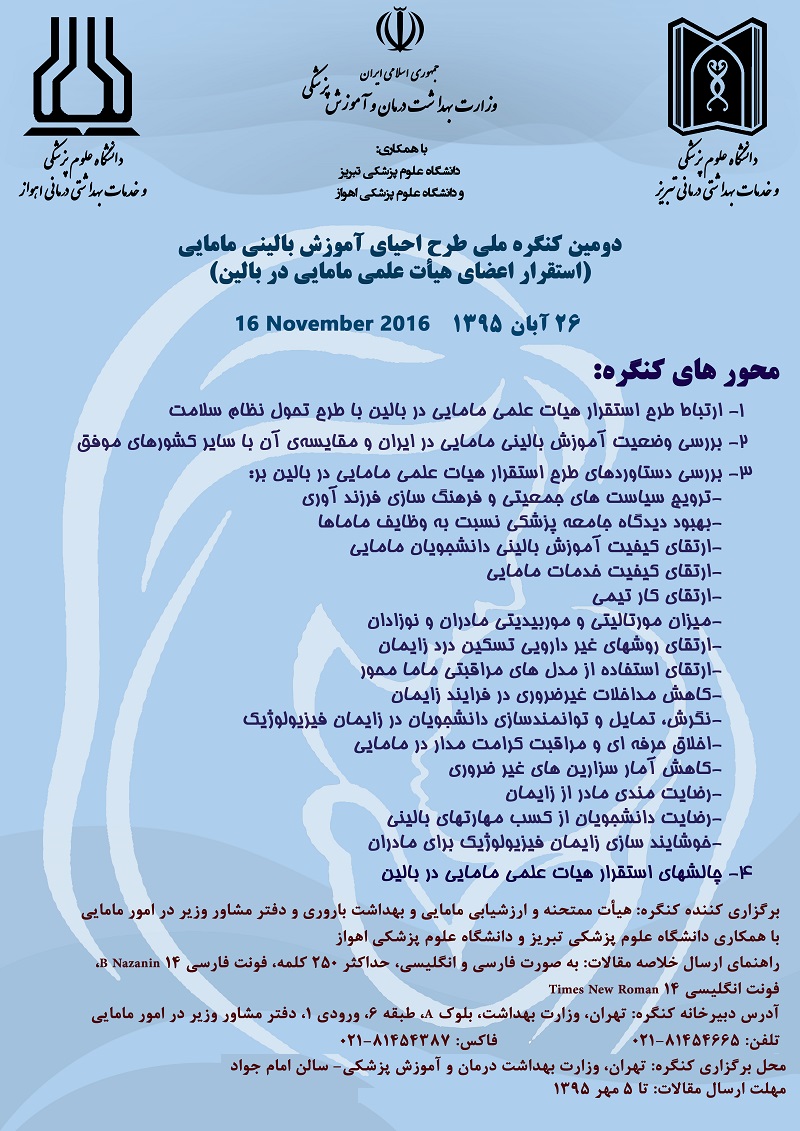 برگزارکنندگان: هیات ممتحنه و ارزشیابی مامایی و بهداشت باروری و دفتر مشاور وزیر در امور مامایی، دانشگاه علوم پزشکی تبریز، دانشگاه علوم پزشکی اهواز