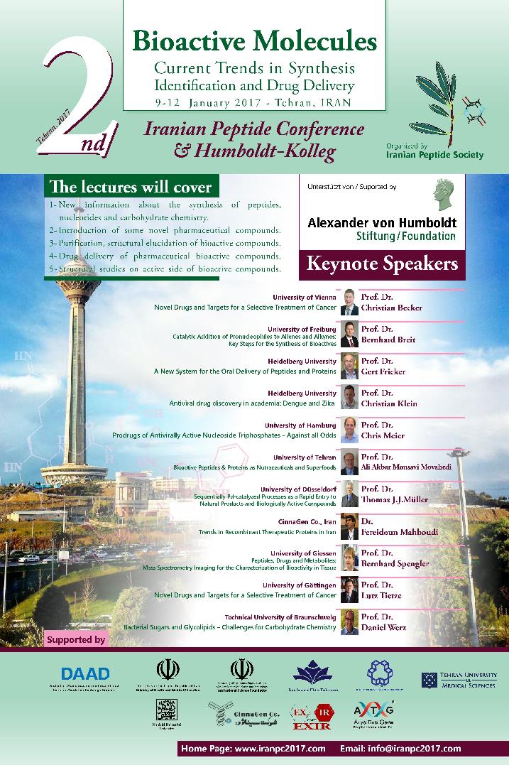 « دومین سمینار بین المللی پپتید ایران » توسط انجمن پپتید ایران و با حمایت بنیاد الکساندر هومبولت آلمان در روزهای۲۰ الی۲۲ دی ماه سال جاری در دانشگاه علوم پزشکی تهران، برگزار می گردد.