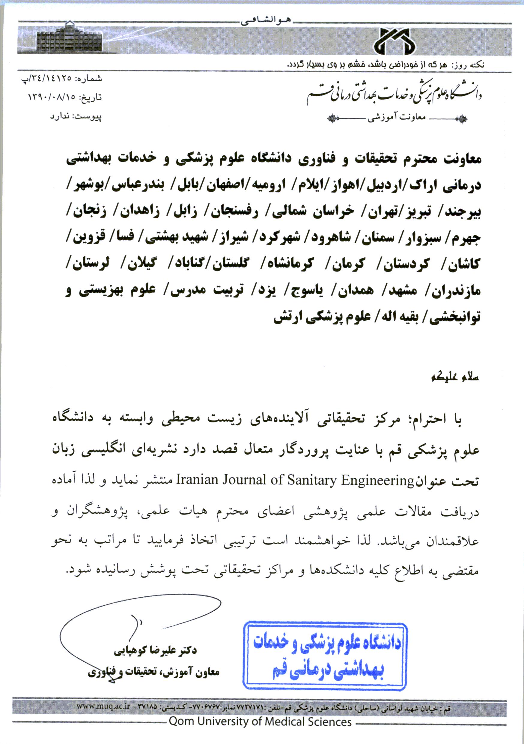 مرکز تحقیقات آلاینده های زیست محیطی وابسته به دانشگاه علوم پزشکی قم قصد دارد نشریه ای انگلیسی زبان تحت عنوان :Iranian Journal Of Sanitary Engineering انتشار نماید و لذا آماده دریافت مقالات علمی پژوهشی اعضای محترم هیئت علمی ،پژوهشگران و علاقمندان می باشد.