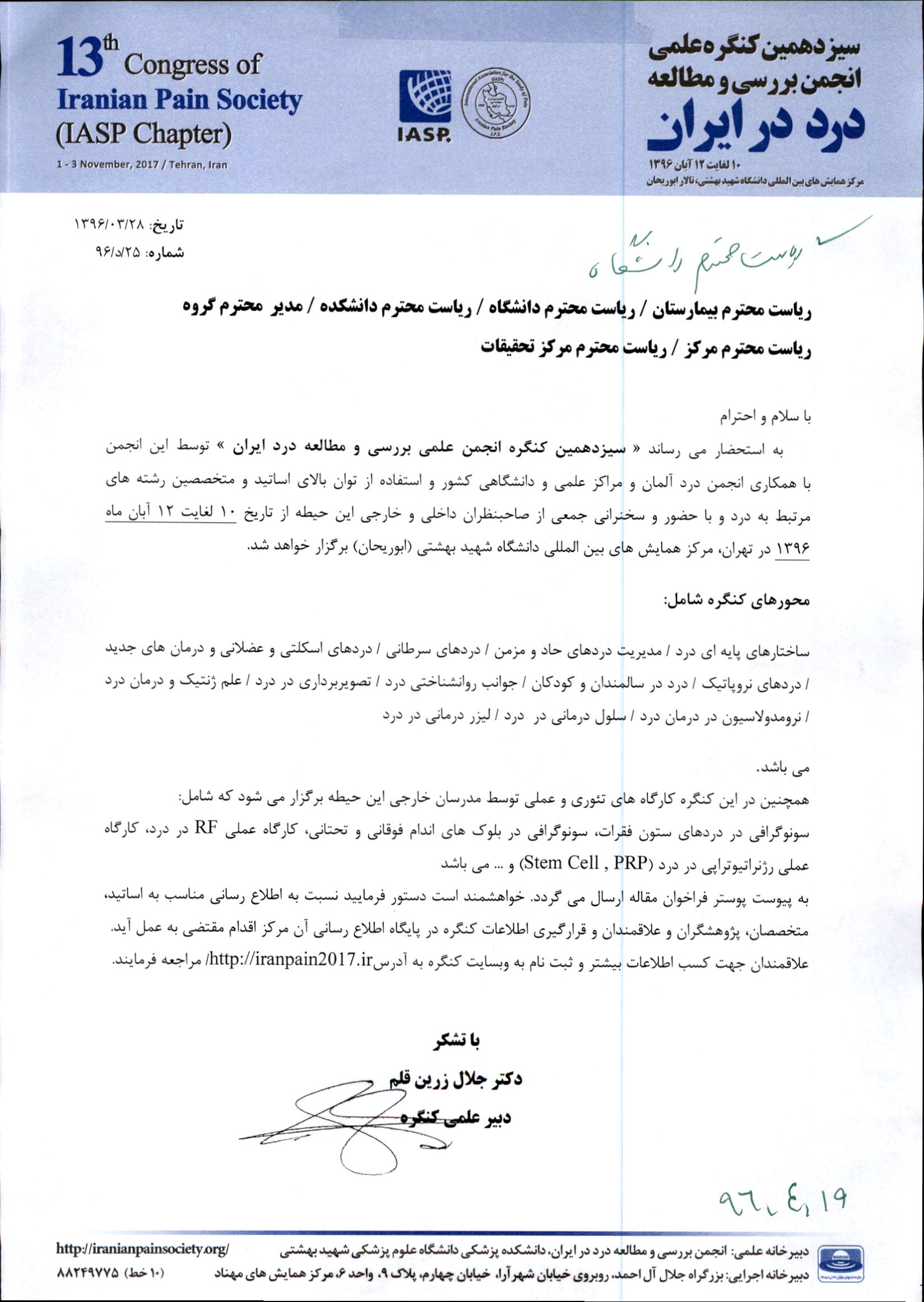 سیزدهمین کنگره انجمن بررسی و مطالعه درد در ایران ۱۰-۱۲ آبانماه ۱۳۹۶
