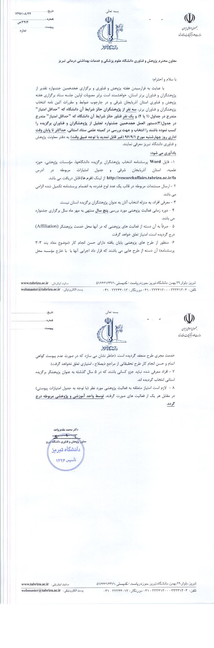 قابل توجه داوطلبین محترم شرکت کننده در جشنواره انتخاب و معرفی پژوهشگران برگزیده استان آذربایجان شرقی در سال 1396