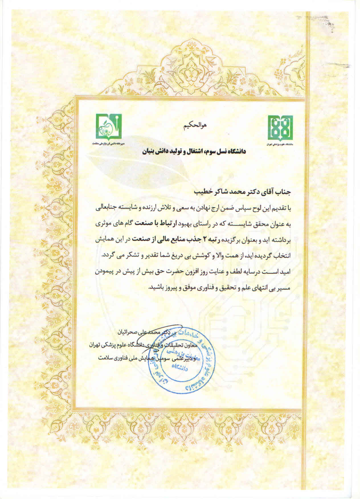 کسب رتبه دوم جذب منابع مالی از صنعت (ارتباط با صنعت) در سومین همایش ملی فناوری سلامت دانشگاه علوم پزشکی تهران توسط جناب آقای دکتر محمد شاکر خطیبی در بین دانشگاه های علوم پزشکی کشور را خدمت ایشان تبریک عرض نموده و از خداوند متعال خواهان موفقیت روزافزونشان هستیم .